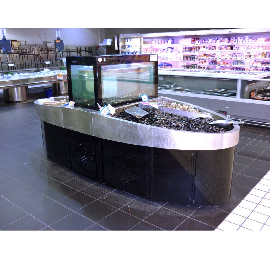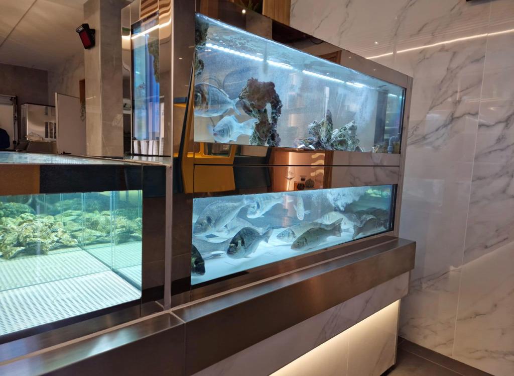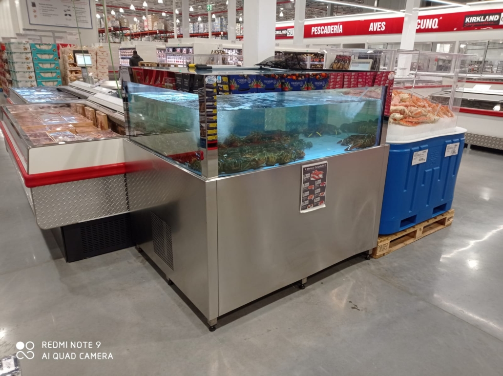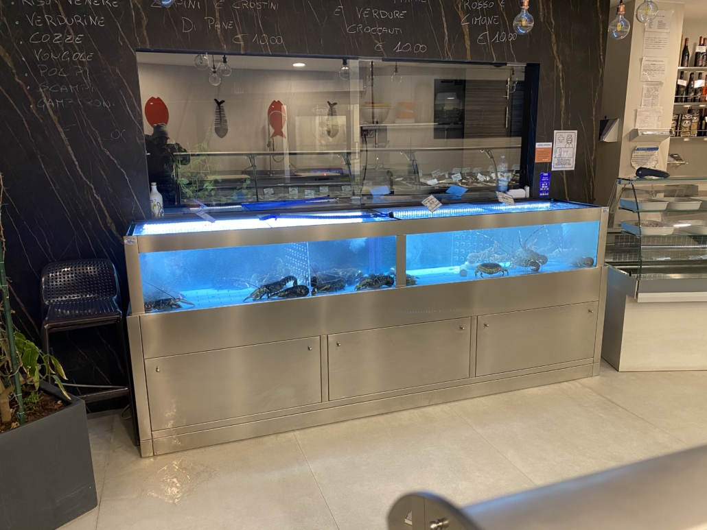 Caratteristiche: vasca in cristallo a vetro camera con verniciatura interna dei vetri ed antisfondamento completa di coperchi, conforme alla nuova normativa sulla sicurezza 81/2008, filtro incorporato a sabbia calcarea, prefiltraggio in ovatta di Perlon stratificato, griglie a “sandwich” per il sostegno e la protezione dei materiali filtranti, base in vtr ad uso alimentare con ruote in acciaio inox, contiene le apparecchiature tecniche di funzionamento pompa di circolazione a basso consumo energetico, impianto di refrigerazione con evaporatore al titanio e termostato elettronico a consumo ridotto, impianto di filtrazione chimica, impianto idraulico realizzato con materiali atossici per uso alimentare , Impianto elettrico a norma IP 55, con centralino e spina 16A con alimentazione elettrica tipo monofase 230 V, dotazione tecnica con: libretto istruzioni uso impianto, termometro, densimetro e retino.