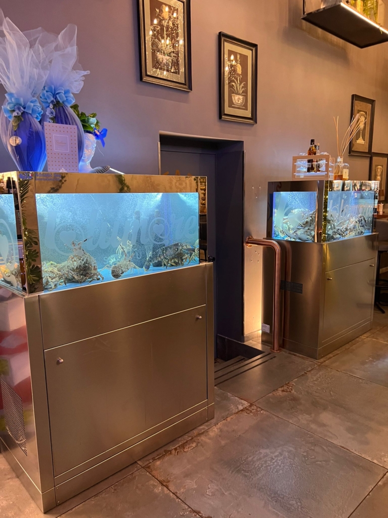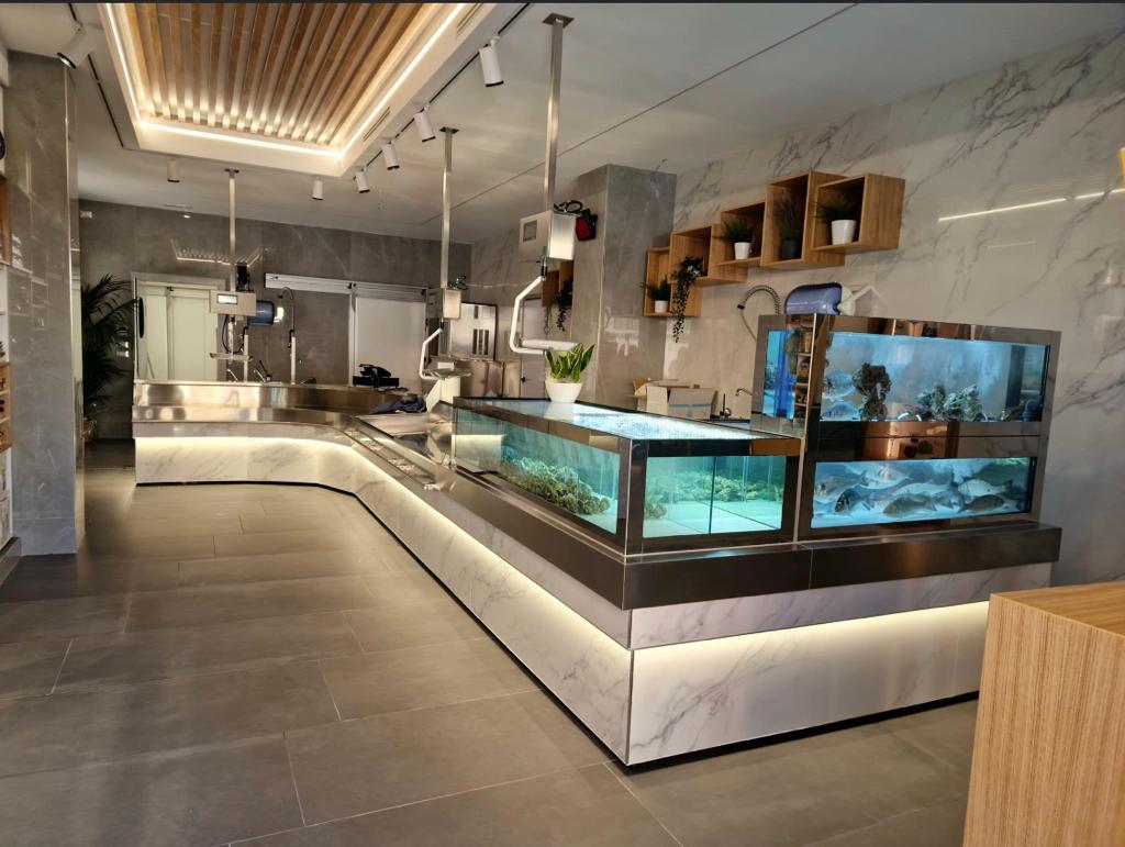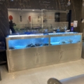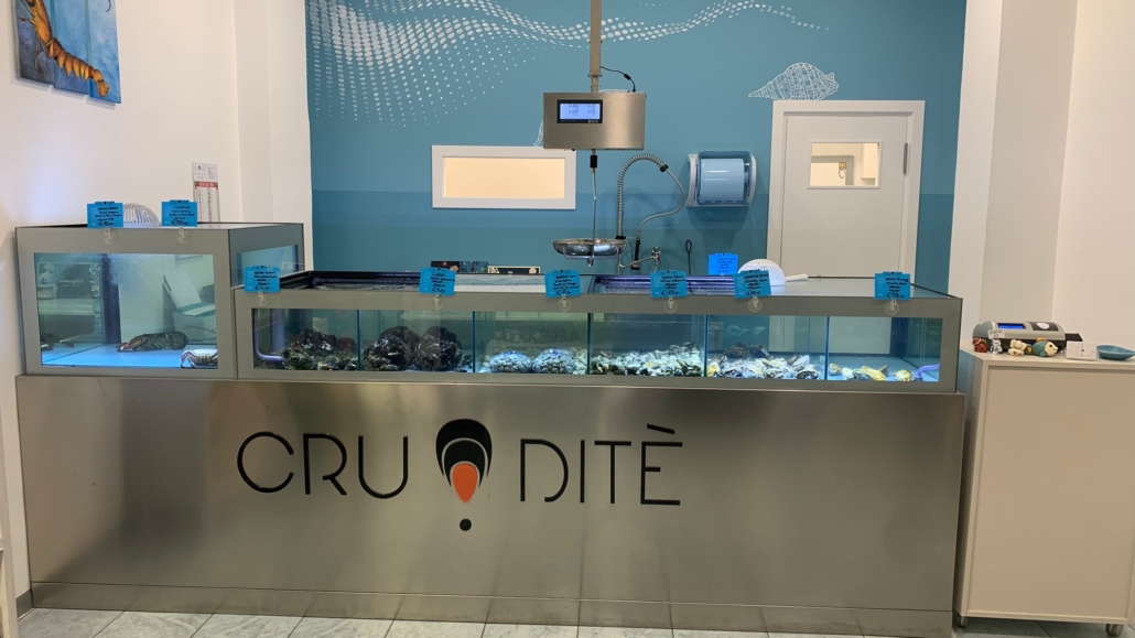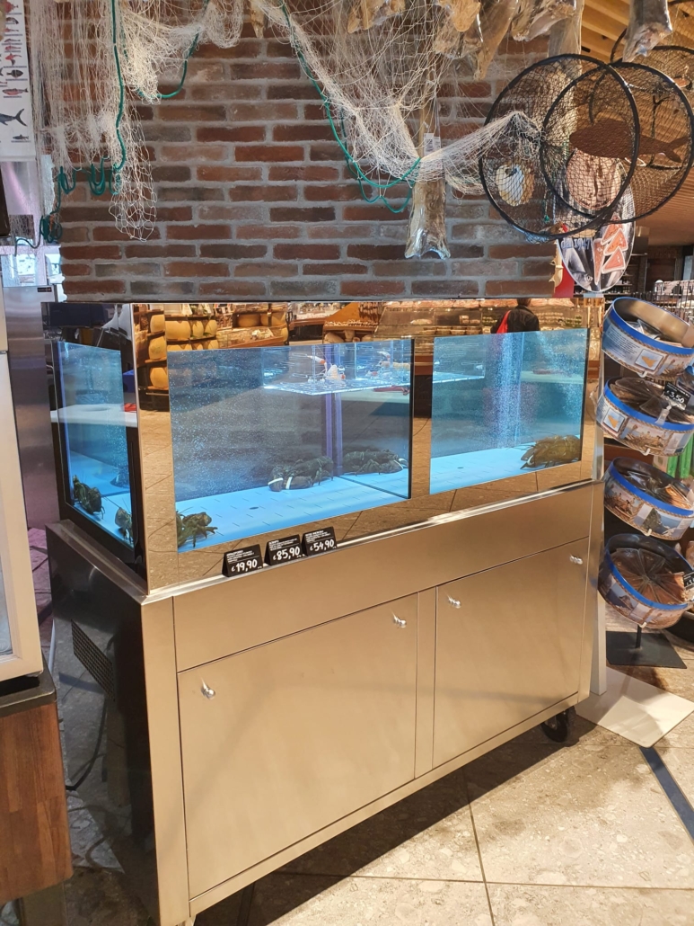 Caratteristiche: vasca in cristallo a vetro camera con verniciatura interna dei vetri ed antisfondamento completa di coperchi, conforme alla nuova normativa sulla sicurezza 81/2008, filtro incorporato a sabbia calcarea, prefiltraggio in ovatta di Perlon stratificato, griglie a “sandwich” per il sostegno e la protezione dei materiali filtranti, base in vtr ad uso alimentare con ruote in acciaio inox, contiene le apparecchiature tecniche di funzionamento pompa di circolazione a basso consumo energetico, impianto di refrigerazione con evaporatore al titanio e termostato elettronico a consumo ridotto, impianto di filtrazione chimica, impianto idraulico realizzato con materiali atossici per uso alimentare , Impianto elettrico a norma IP 55, con centralino e spina 16A con alimentazione elettrica tipo monofase 230 V, dotazione tecnica con: libretto istruzioni uso impianto, termometro, densimetro e retino.